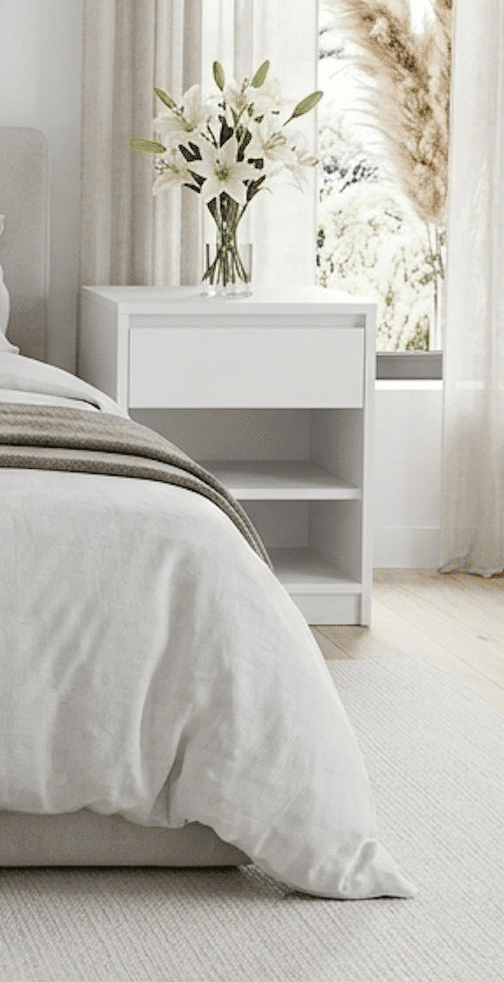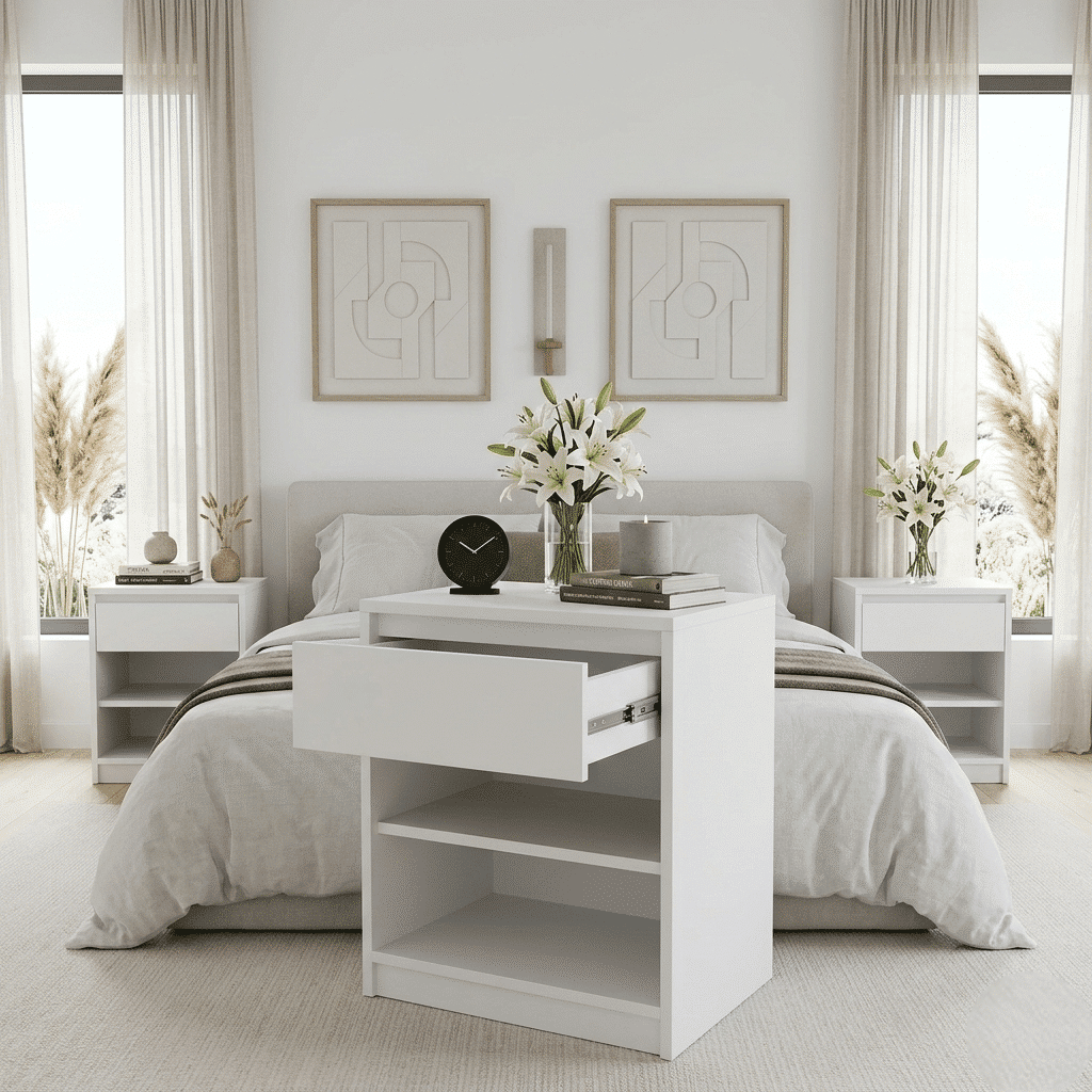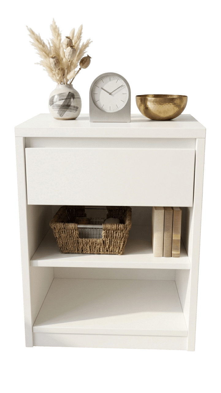 Nuestras mesas de luz cuentan con refuerzos únicos en el mercado: Escuadras encastradas, encoladas y entarugadas, brindando durabilidad y firmeza en las mesas.